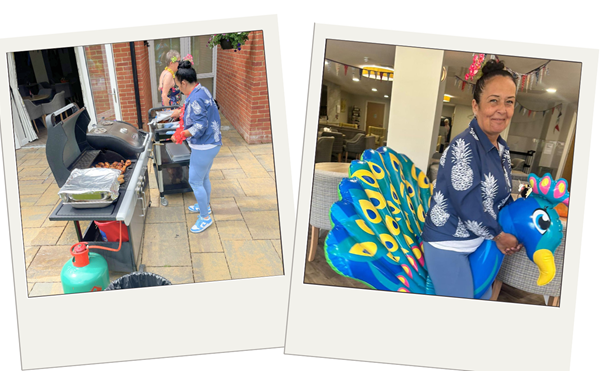 The garden was transformed with bright decorations, palm leaves, floral garlands, and an inflatable flamingo, setting the scene for a fun and relaxing afternoon. Sharon, our brilliant Kitchen Manager, took charge of the BBQ, serving up delicious summer favourites... and even found time to hop onto an inflatable peacock!